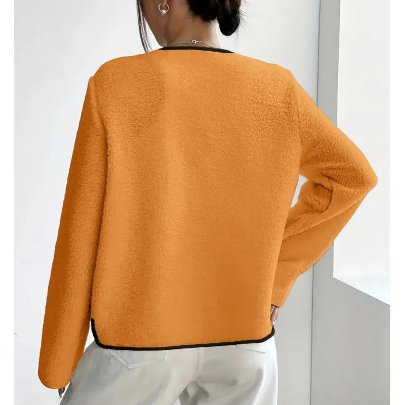 The Cressida Jacket is a bold, statement-making layer designed for women who love effortless style. With its bright orange hue and clean black trim, it adds a refreshing edge to casual outfits.