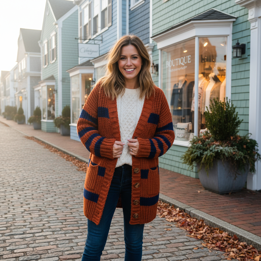 "This sweater is so cozy and soft, and I love the colors — they feel cheerful but still subtle. The fit is relaxed without being too loose, and it’s warm enough for a walk outside on a crisp fall day. I’ve had several compliments already!"